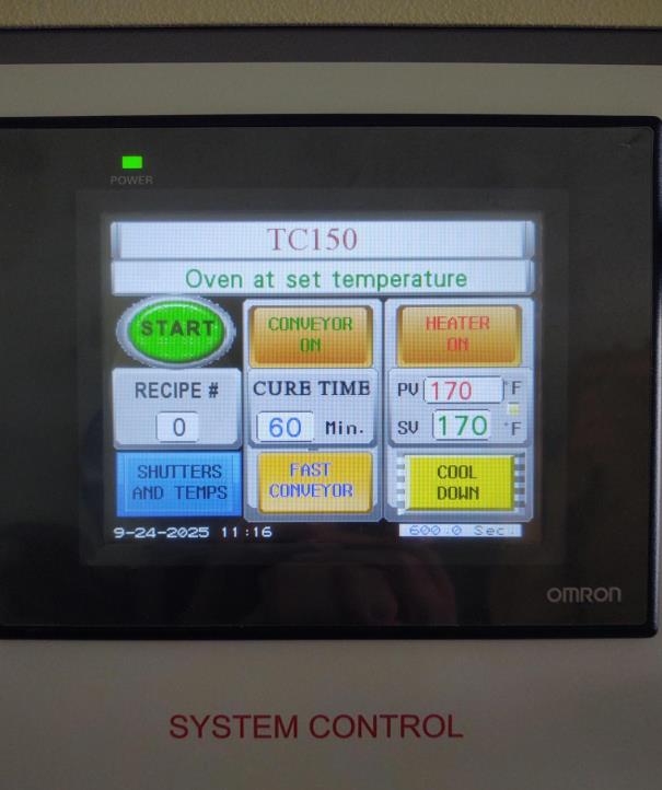 The TC-150 Conveyorized Oven is the most flexible conveyorized oven available for tackdrying or final curing of solder mask and legend ink. Conveyorized ovens are used most effectively to improve productivity, decrease variability, and increase yield in solder mask and legend ink processes. The TC-150 has a heated chamber of 3.0 meters using a variety of racks with different pitches and spacing available separately. Air distribution in the TC-150 is extremely even throughout the oven, achieving 4°C (TIR) temperature distribution across the panel at tack-dry temperatures and 6°C (TIR) at final cure temperatures.